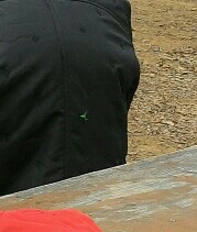 同じピクニックテーブルのいすに腰掛けてたひとの背中に