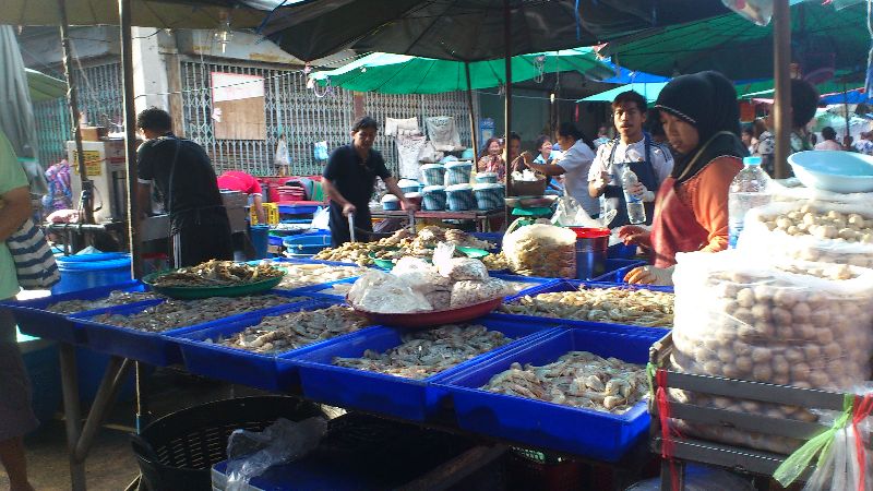 帰り、市場の中を通って大根のスープや串焼き肉、カオニャオ、