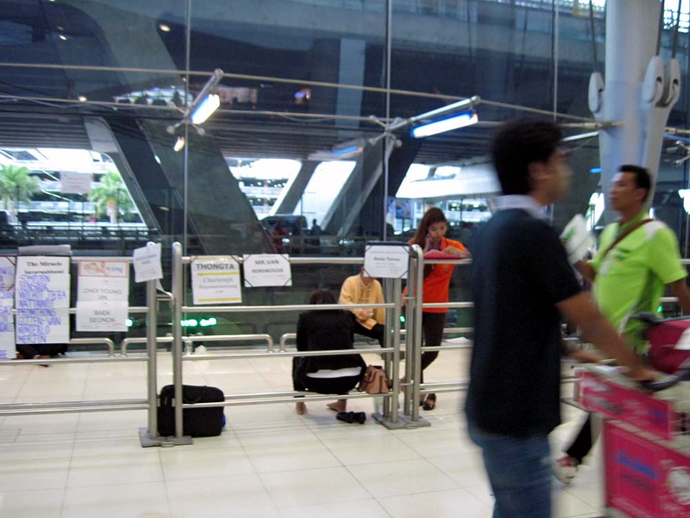 空港内から4番出口にむかって右の柵にいくつもホテルの名前がかかってて