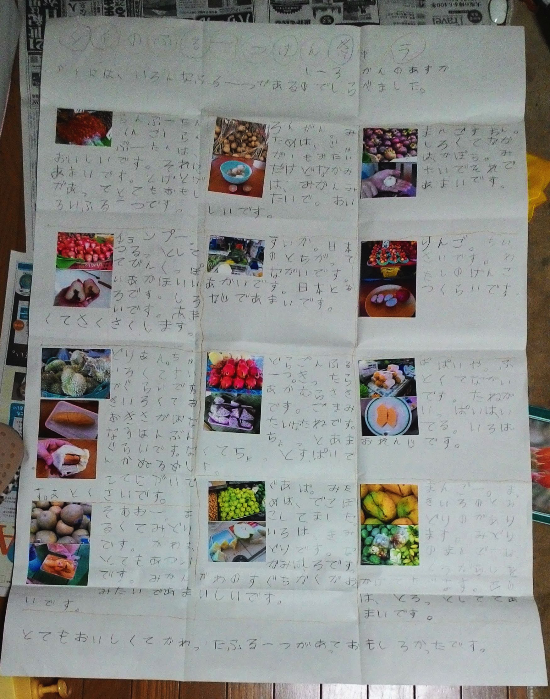 たろさんは「タイの市場研究」で、けろりは「タイのフルーツけんきゅう」