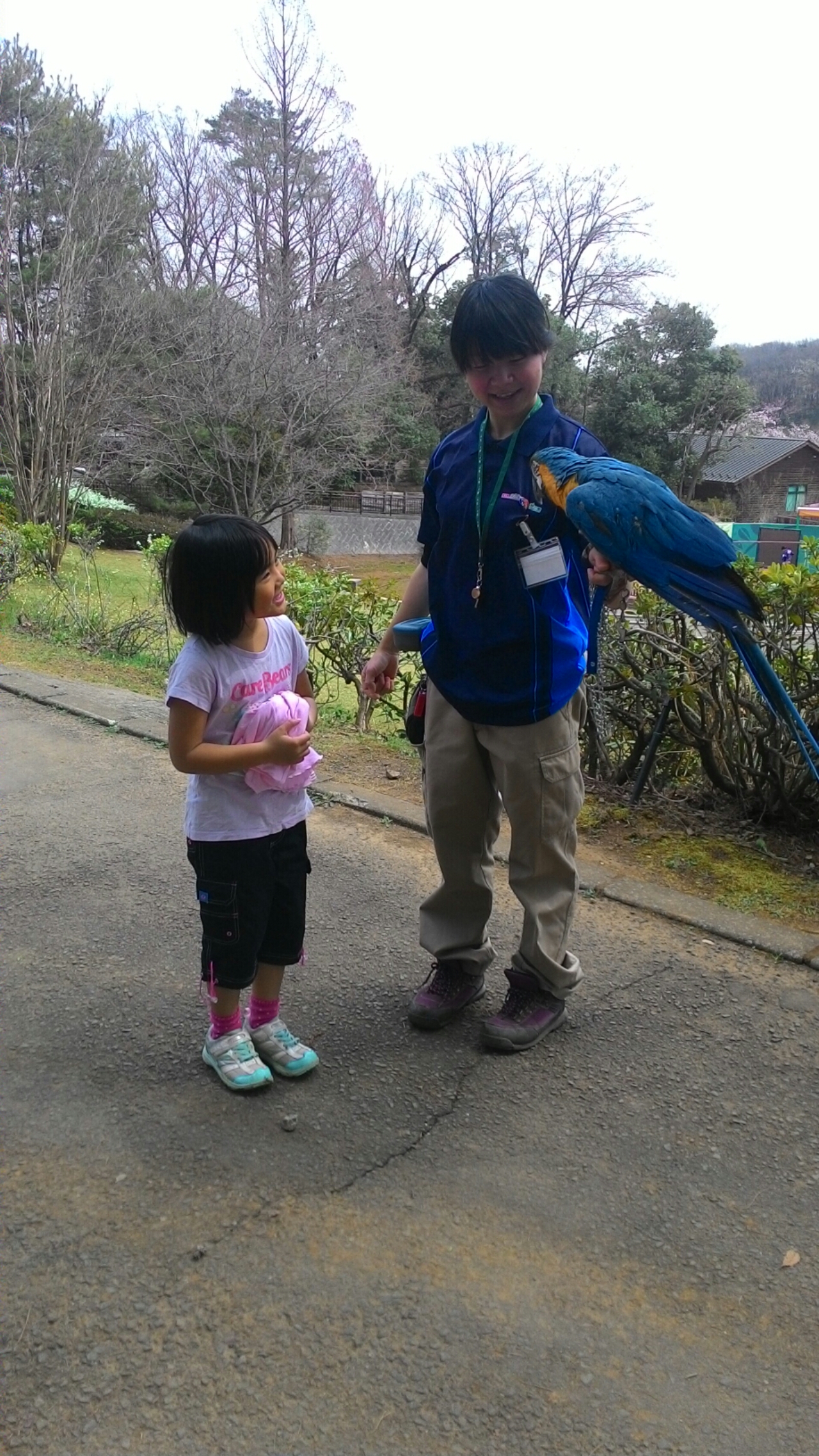 コンゴウインコつれた飼育員さんがいて