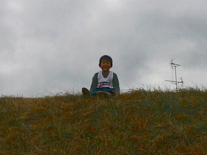 走り終わって土手の上から機嫌よさそうにほほえむたろさん