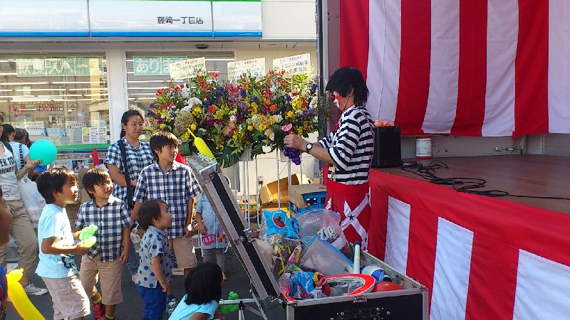 特設舞台でクラウンが大道芸やっていて子どもたちが集まっている。