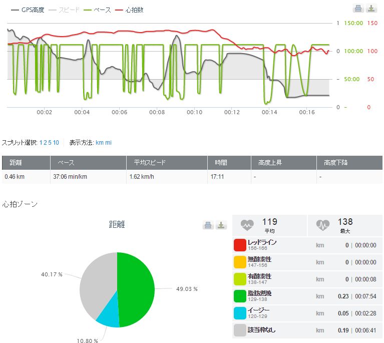 始めのほうの心拍の低いところはウォーキングしてたところです