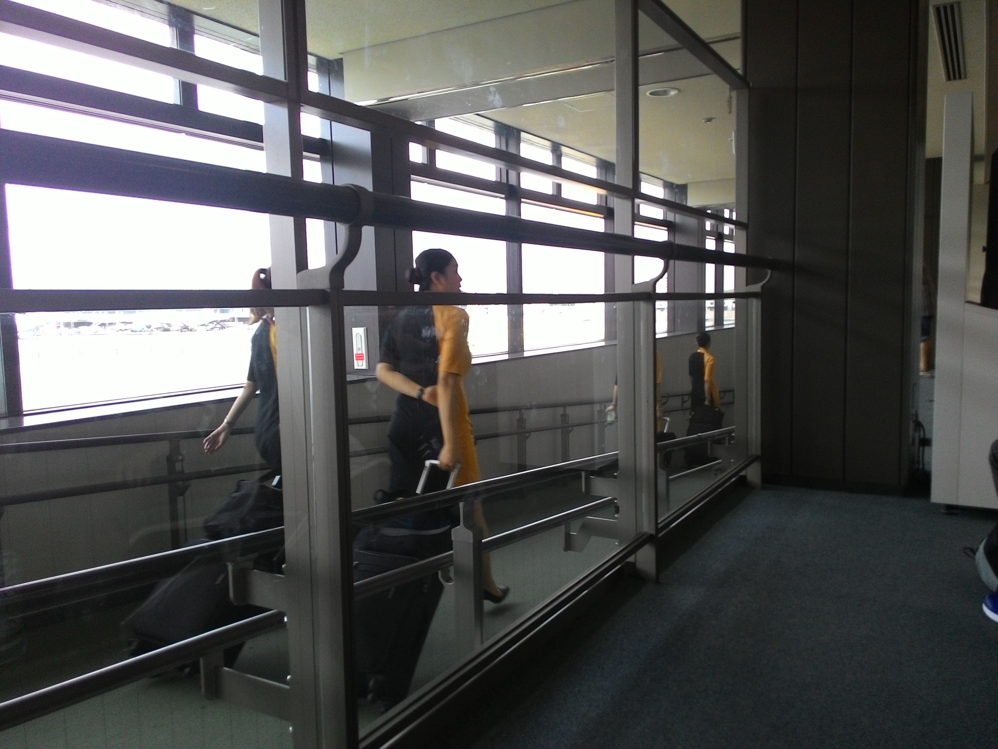 というか、待合ロビー外側の廊下の出窓に腰掛けてクルーが朝ご飯食べてる。