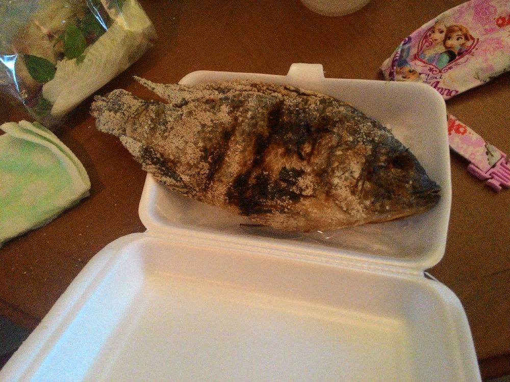 私はソイ・ニャリュプリの屋台街に行って、塩焼きの大きな魚と、
