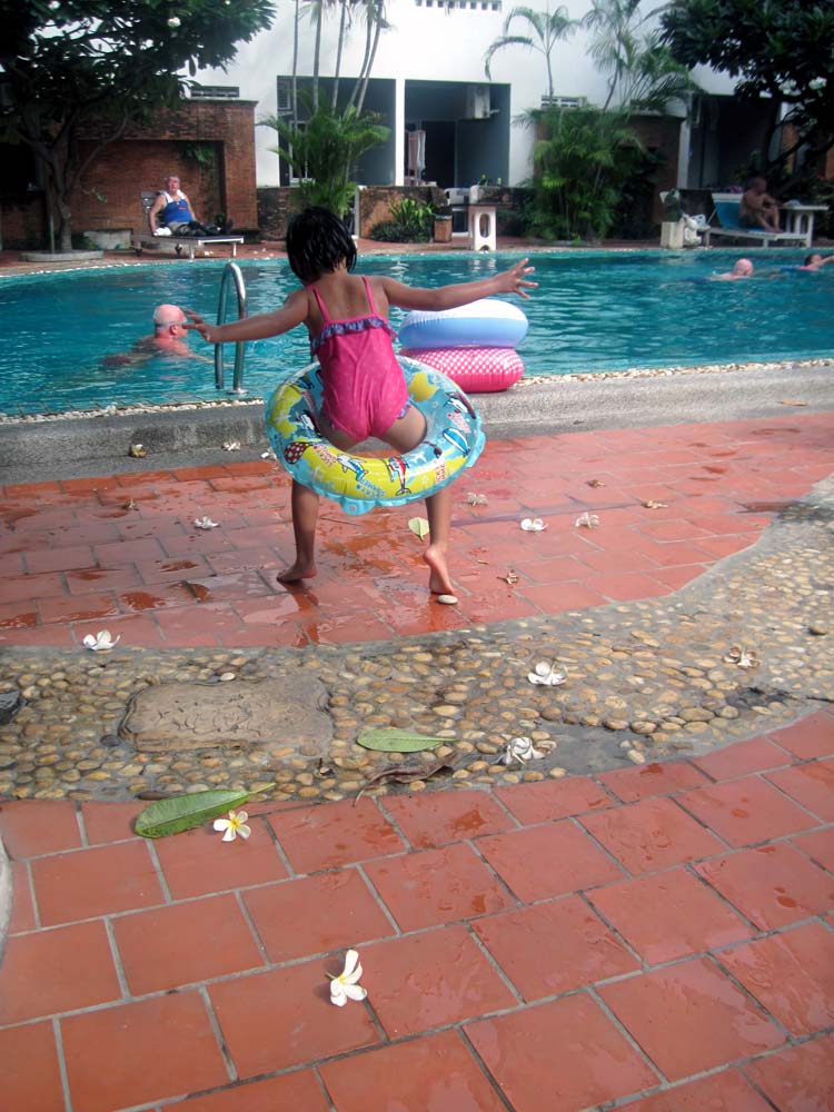 プールサイドの椅子もベッドもベンチもほとんどいっぱいで、
