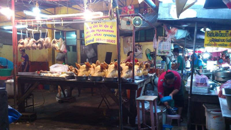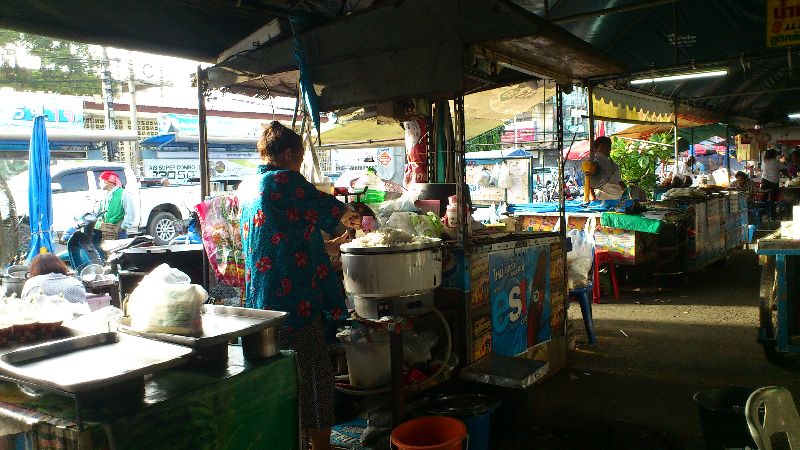 帰り、市場の中を通って大根のスープや串焼き肉、カオニャオ、