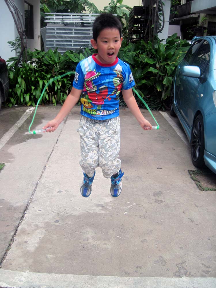 朝食前にたろさんと、中庭の駐車場で縄跳びの練習。