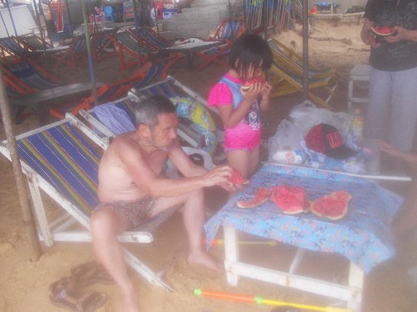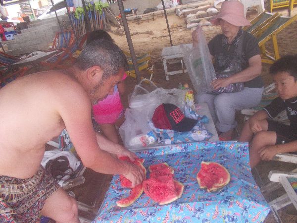 そこでおばあちゃんにはビーチに戻ってもらって、私がすいかをとりに戻った。