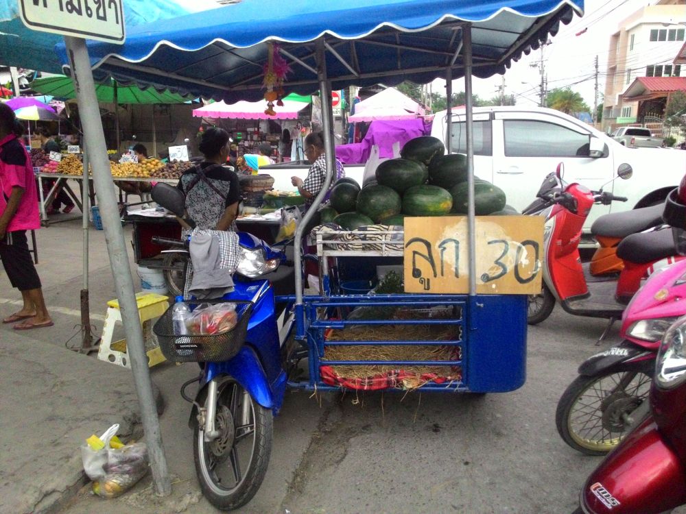 市場外に来ていた屋台がスイカをたくさん積んでいる。