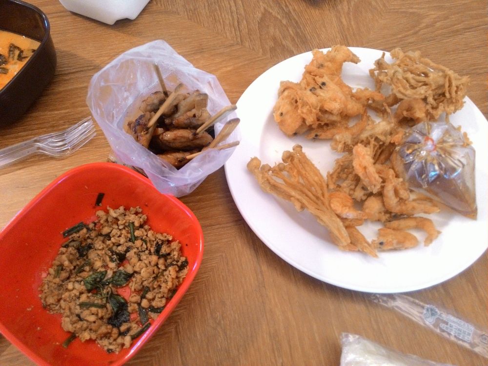 市場で串焼きとカオニャオに、いかの炒め物、