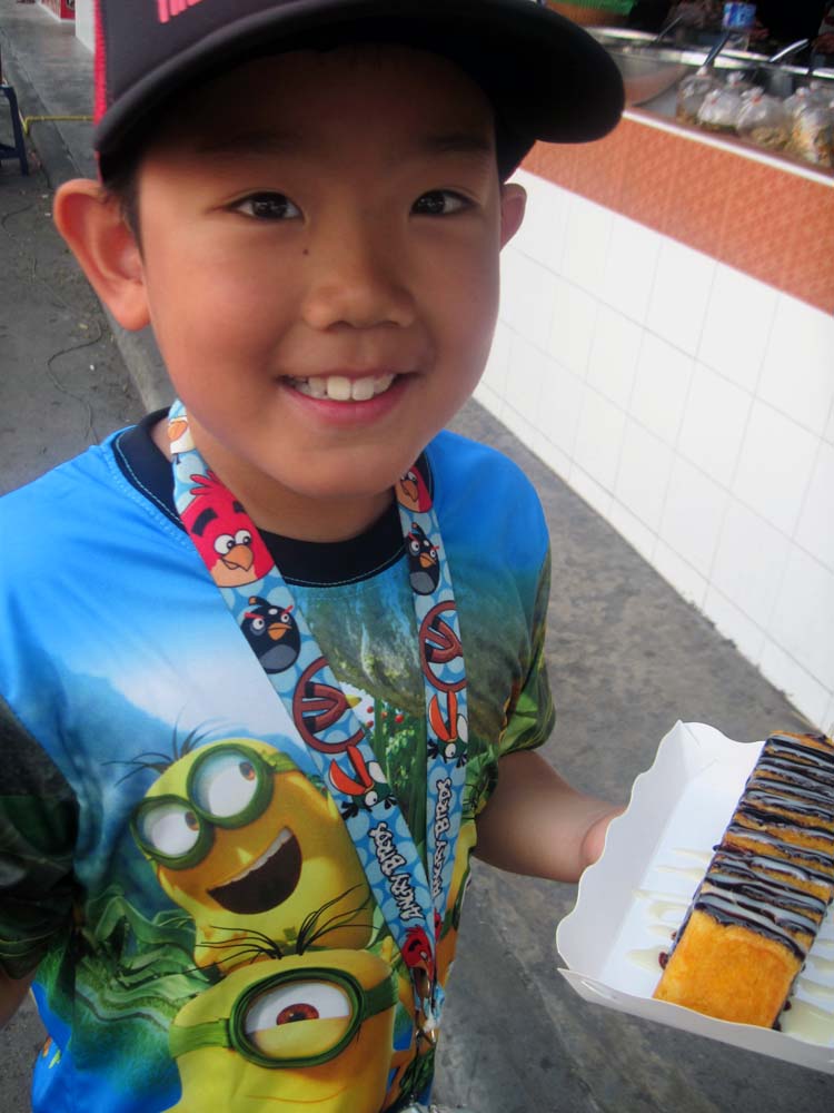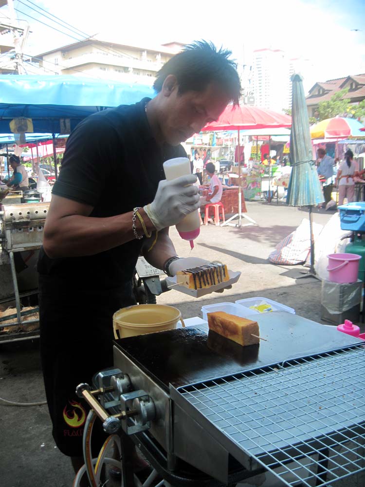 セブンイレブンの前の屋台で串焼きとカオニャオを買い、