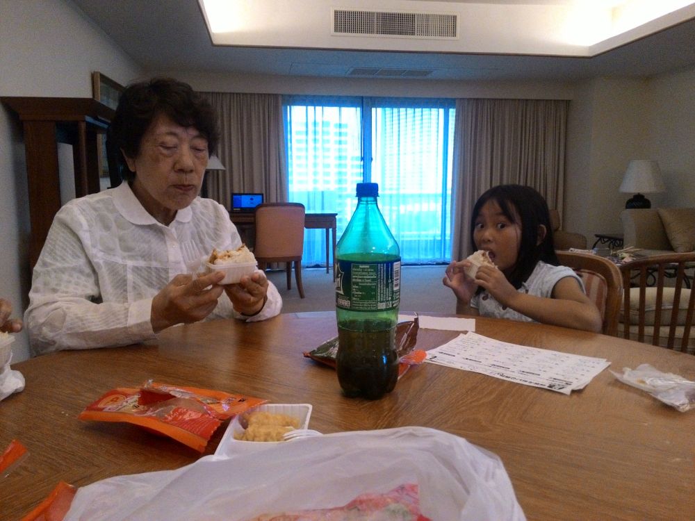 汁そばを3杯買ってきてプールサイドのテーブルでごはんにした。