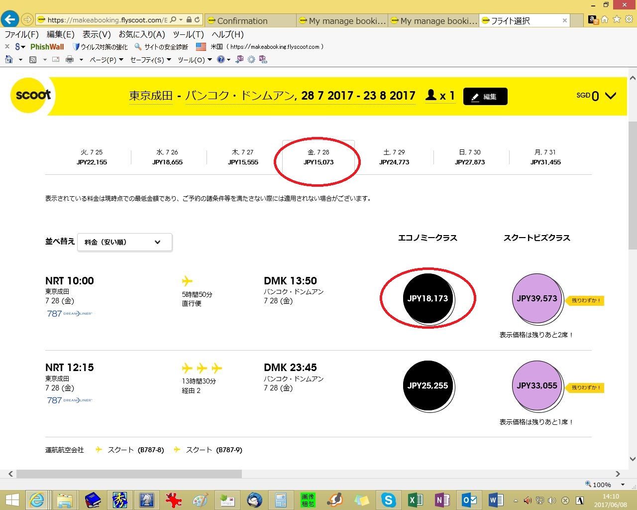 6月に入ってあらためて見るとその近辺の日取りではもう安い日がなく