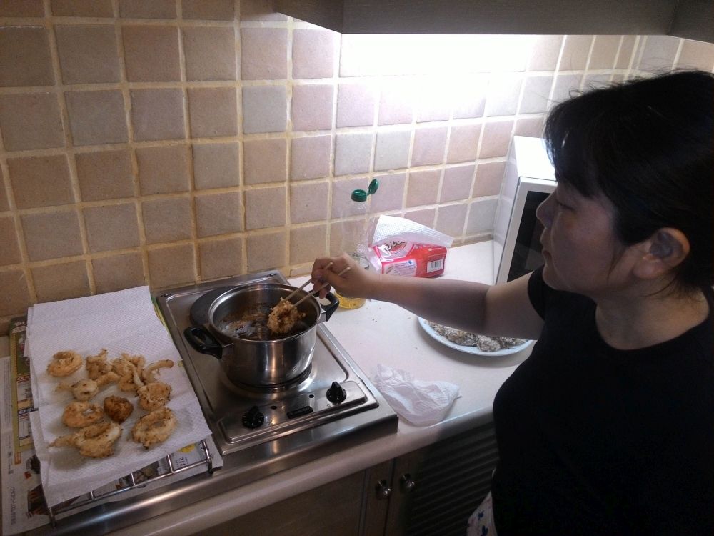 戻ってエビとイカを揚げて、できたてを食べ始めてもらった。