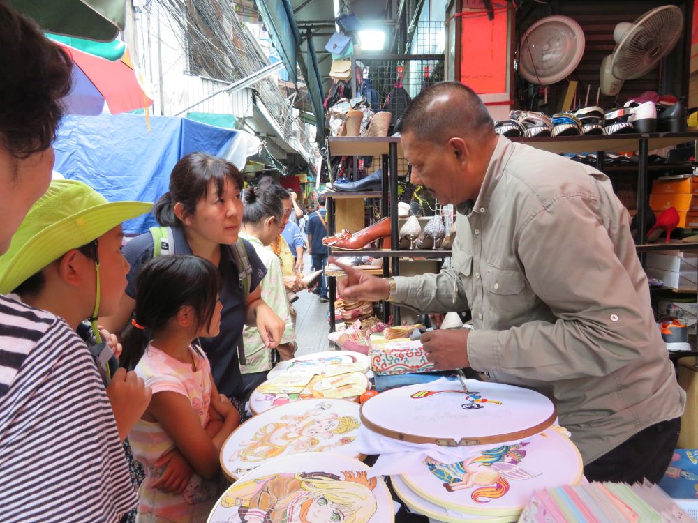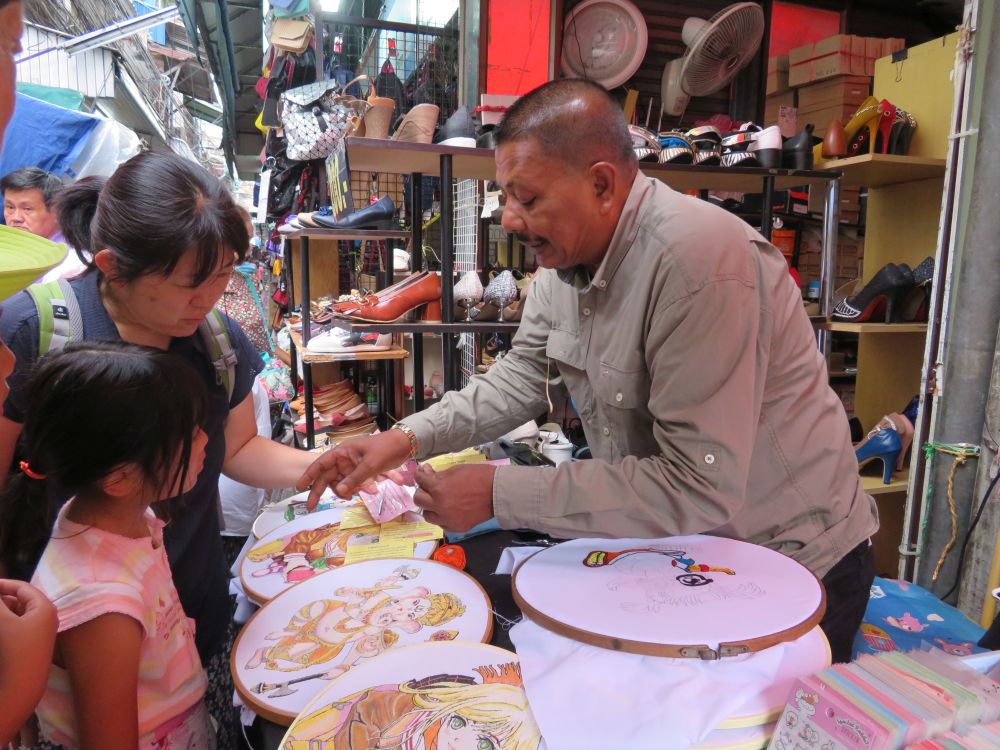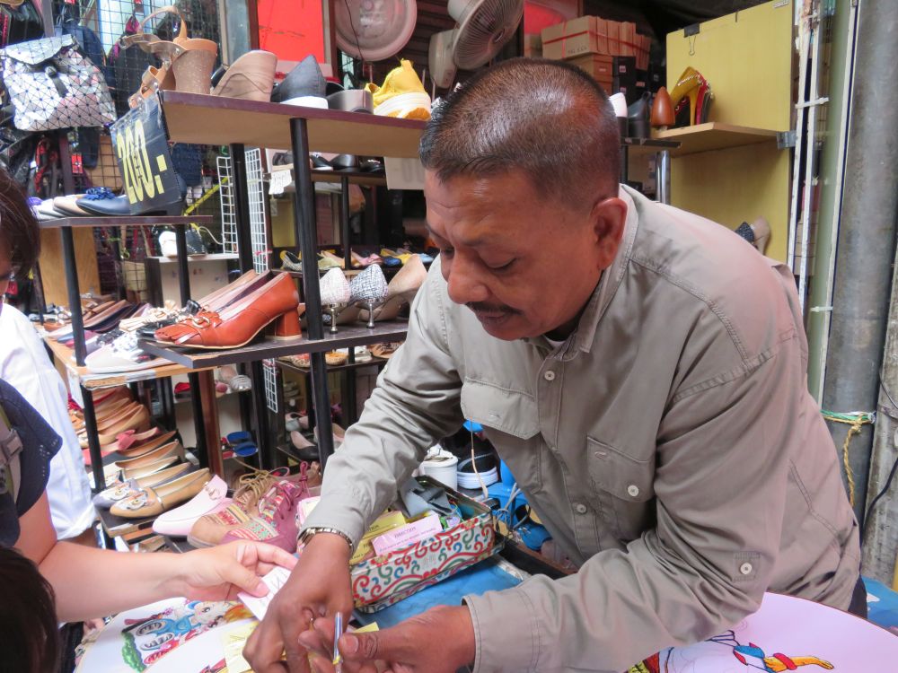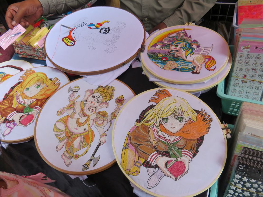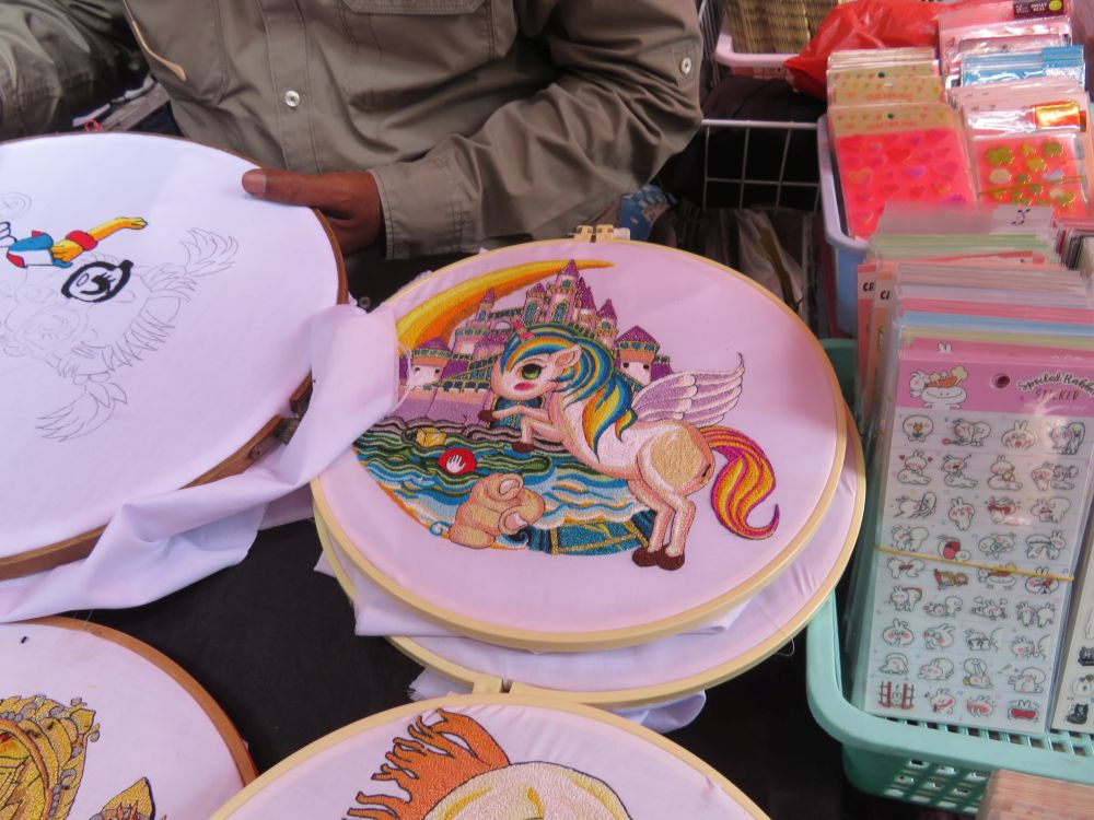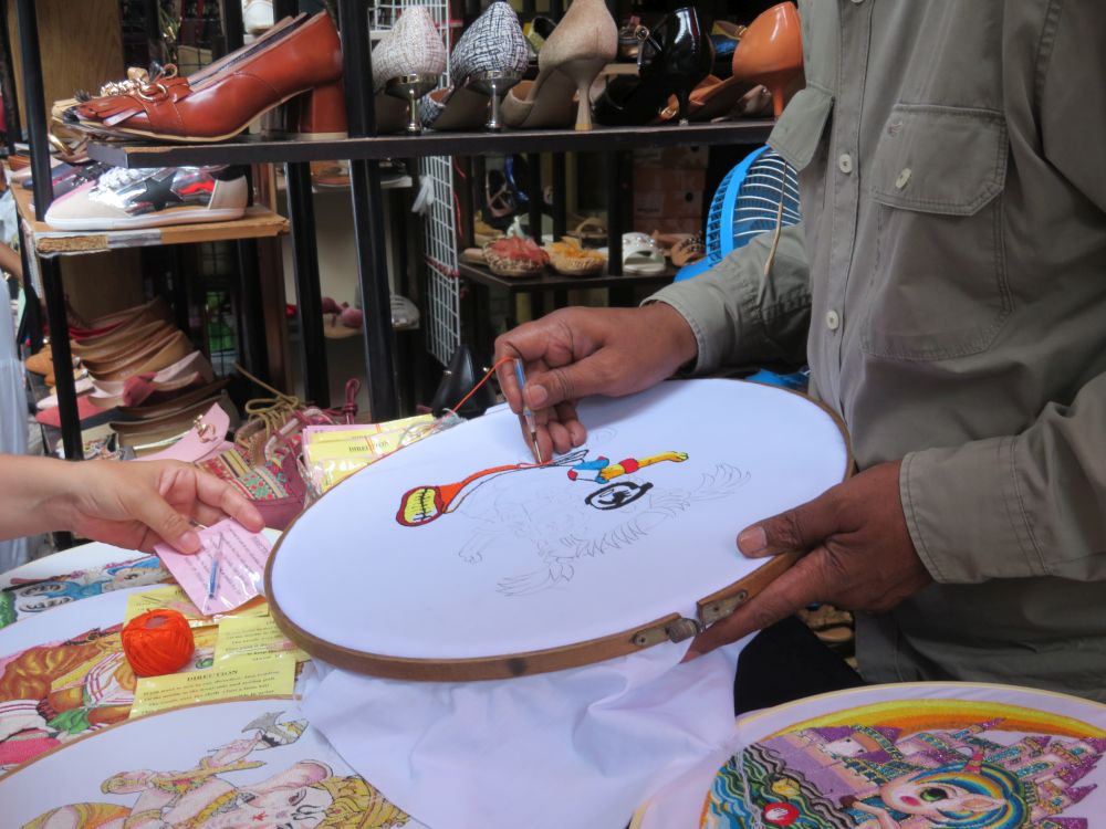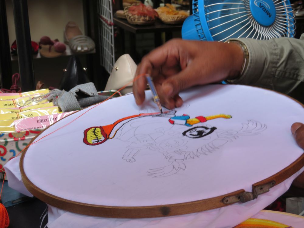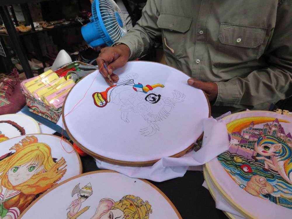 道端でみごとな刺繍をしているおじさんがいて、たろさんとけろりと